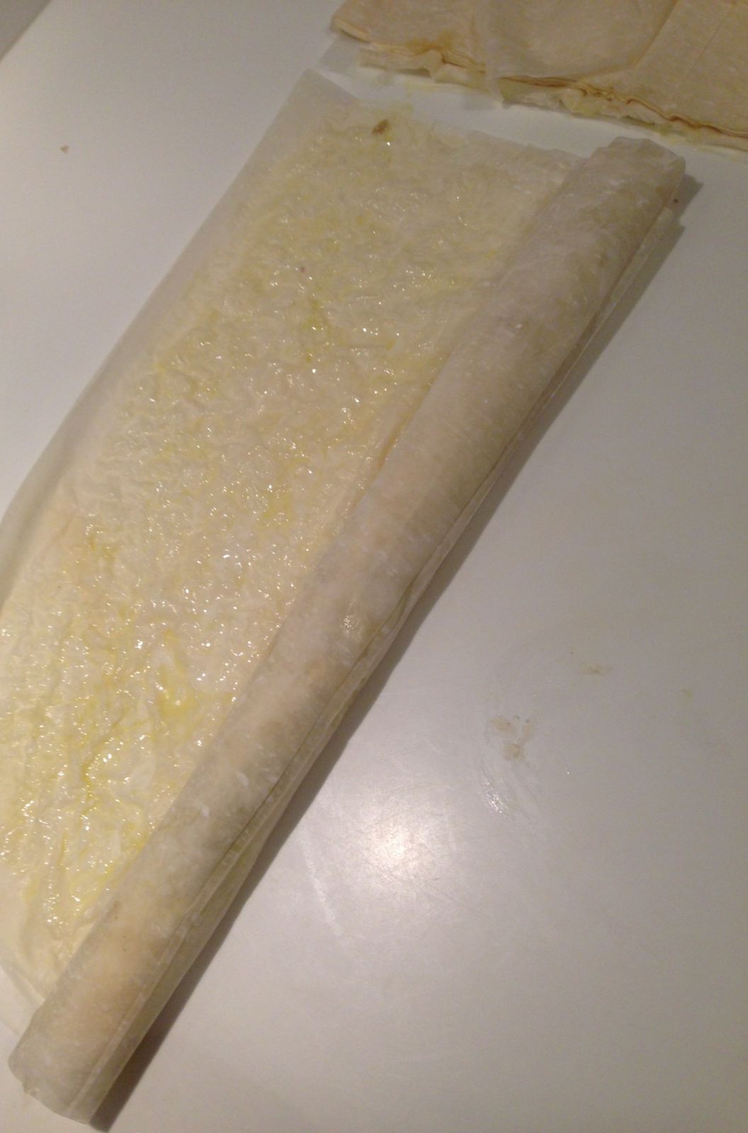 İkinci yufkanın üzerine fırça yardımıyla sodalı karışımdan sürelim. Üçüncü yufkayı üzerine serip tekrar karışımdan sürelim. Dördüncü yufkayı da serip tekrar karışımdan sürelim. Dört kat olan yufkalarımızın uç kısmına kıymalı harçtan sıralayalım. Rulo yaparak kağıt serdiğimiz tepsiye koyalım. Bu şekilde hazırladığımız ruloları tepsimize dip dibe sıralayalım.