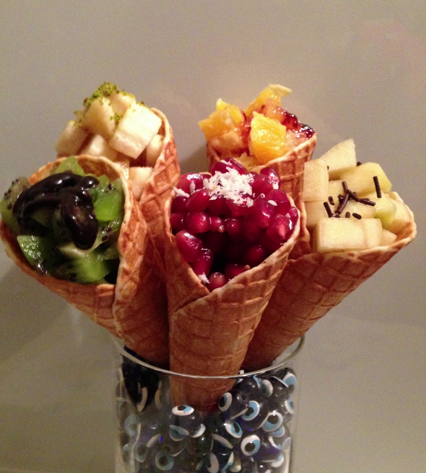 Kivi, elma, nar, portakal ve muzları külahlara koyup servis edebilirsiniz.