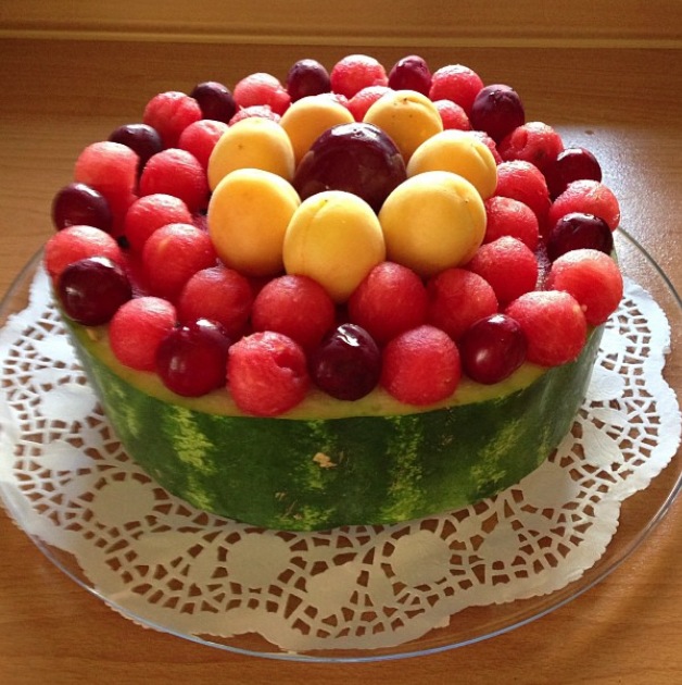 Bir bütün karpuzun alt ve üst kısmını keserek ara taban oluşturalım. Kestiğimiz parçaların içinden dondurma kaşığı ile yuvarlak toplar yapalım. Bu topları üzüm ve kayısı eşliğinde karpuza dizelim. Bu şekilde hazırlayacağımız karpuzu çeşitli şekillerde süsleyebiliriz.