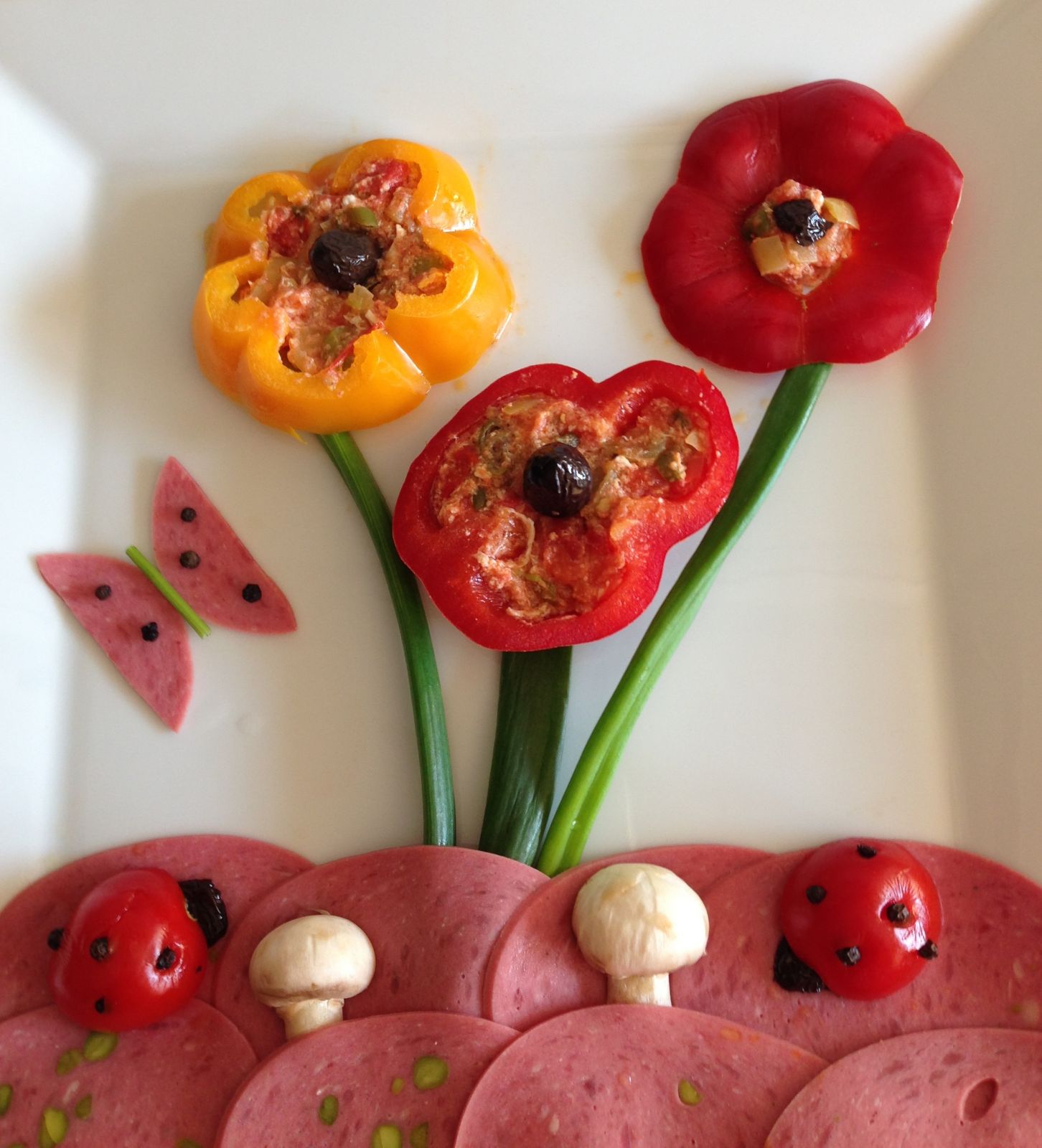 Yukarıdaki tabakta, biberden yaptığımız çiçeklerin ortasına menemen koyabiliriz.